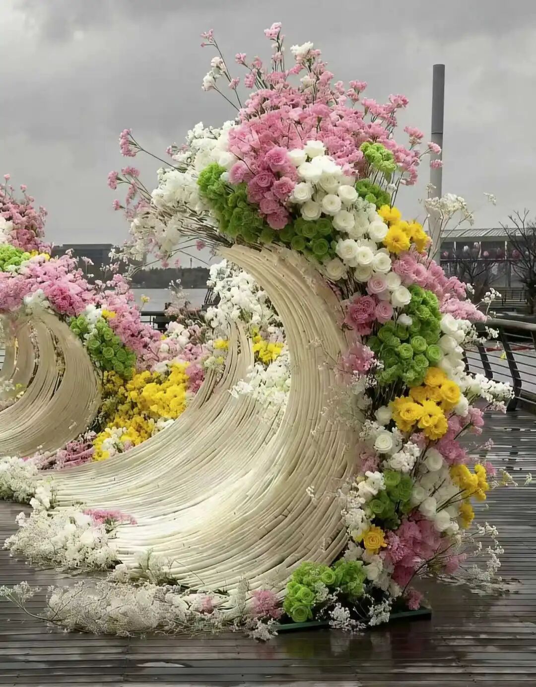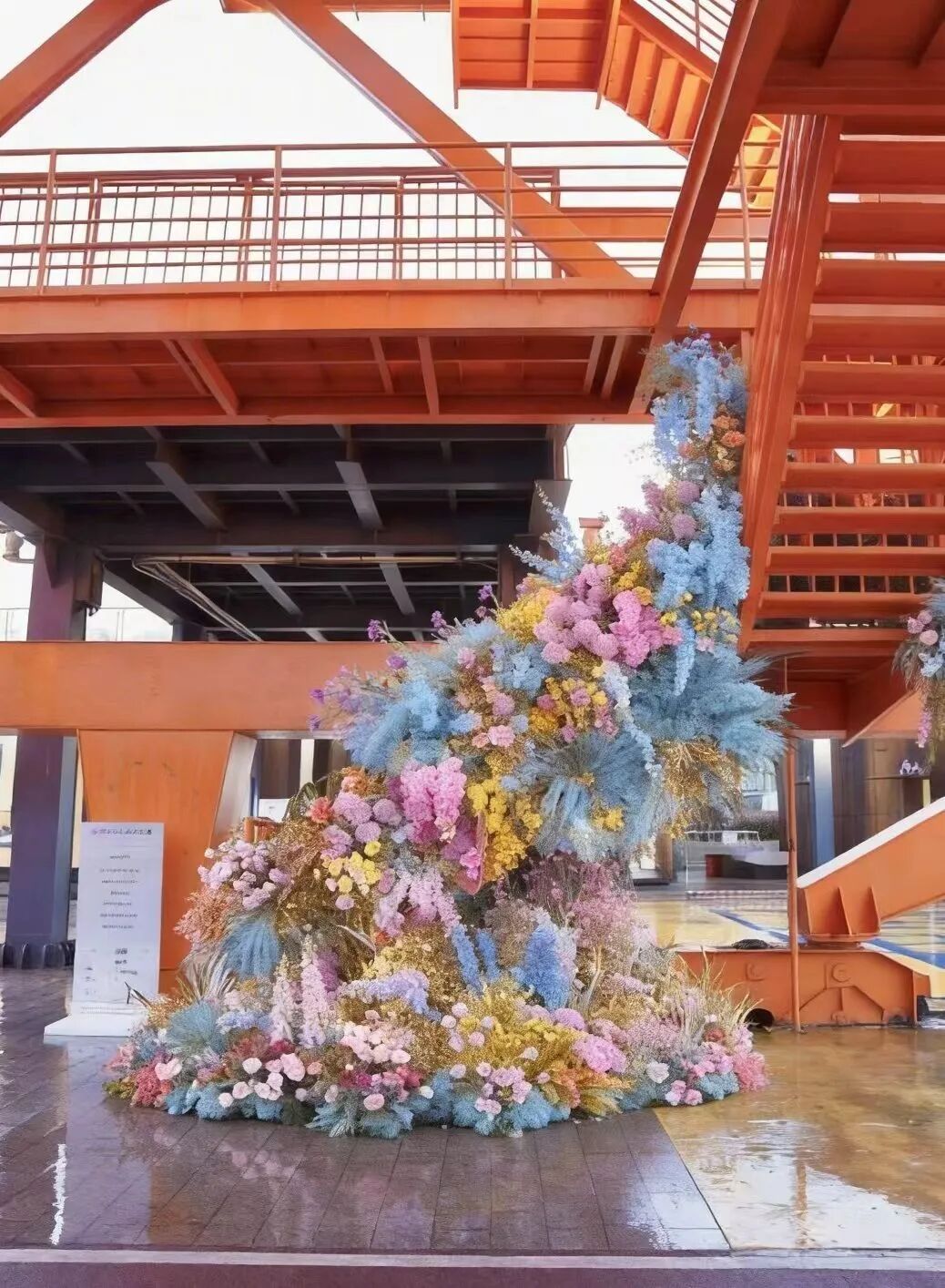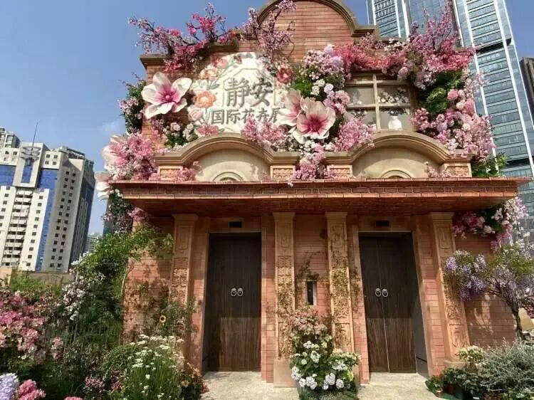 这个景点用石库门造型的装配将电梯包裹,门头上点缀着用干花、长生花、玻璃花等多样工艺制作的白玉兰、樱花、梅花等,两扇电梯的门则作念成了石库门的门。