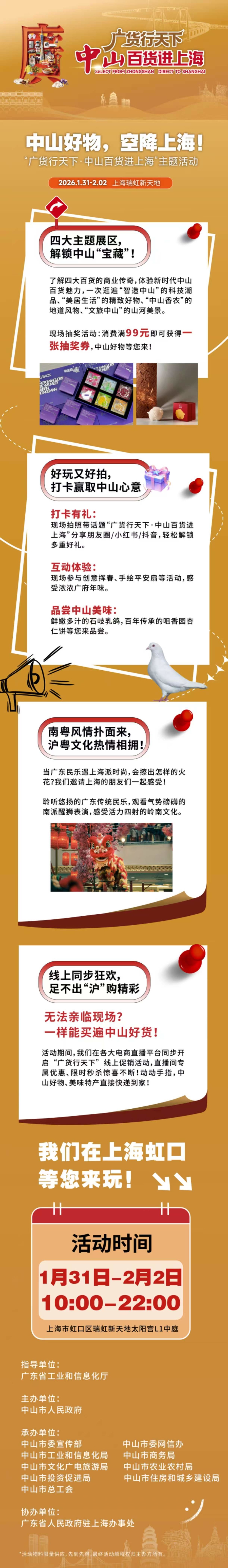1月31日至2月2日,“广货行天下·中山百货进上海”活动将在上海瑞虹新天地太阳宫举行,广东中山将携智造优品、特色风物与文旅魅力,续写香山商帮与上海滩的百年佳话。