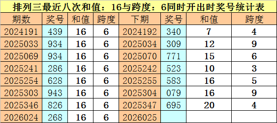 开奖回顾:体彩排列三第2026024期奖号为:268。和值为:16,跨度为:6。