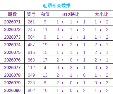 开奖总结:福彩3D开奖号为802,和值为10,其中奖号012路比为1:0:2,大小比1:2。