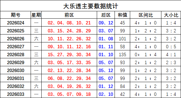上期记忆:大乐透上期奖号为:前区03 05 07 09 18,后区02 10,前区奖号和值为42,区间比4:1:0,大小比为1:4,