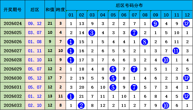 前区和值分析:上期开出和值42,近10期和值在42-135之间,近十期和值平均值是85.5,本期展望和值有高潮趋势,温顺和值出刻下100-105区间。