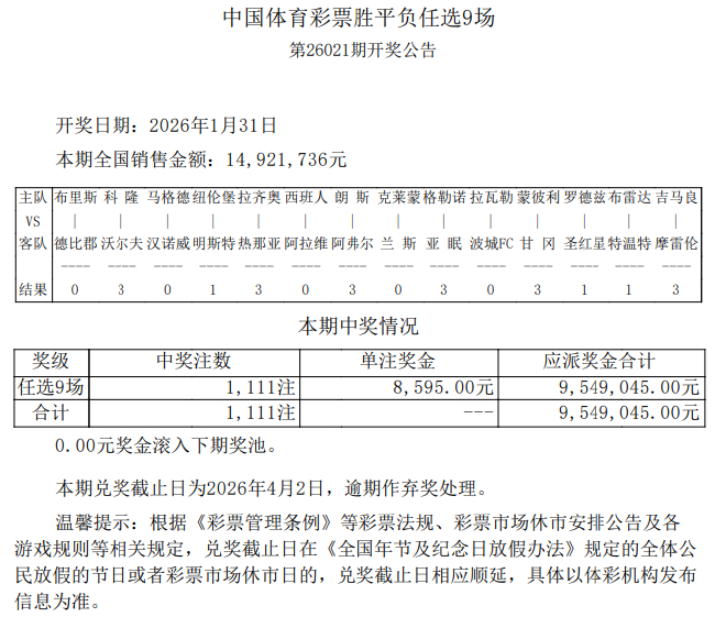 北京时间1月31日,足彩第26021期任九开奖结果揭晓。本期任九开出1111注,单注奖金8595元。本期任九投注总额为14,921,736元。