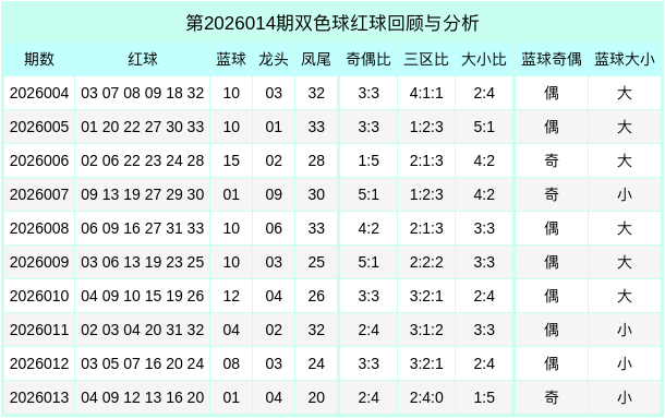 当期红球号码大小比为3:3,三区比为3:1:2,奇偶比为2:4,3组连号02,03,04,31,32。蓝球开出【小偶】形态的号码4。