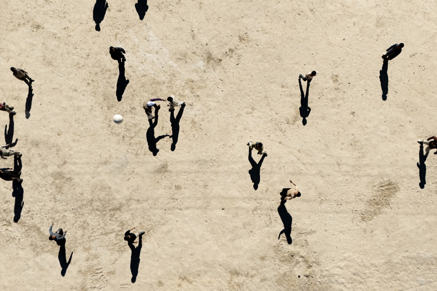 2025年1月14日,西藏日喀则,定日县发生6.8级地震后的灾区,在措昂村活动板房旁边,安置点的孩子们正在进行一场足球比赛。