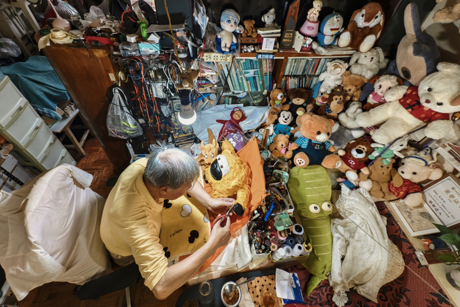 2025年6月7日,上海,年近八旬的“娃娃医生”朱伯明正在挑灯修复娃娃。