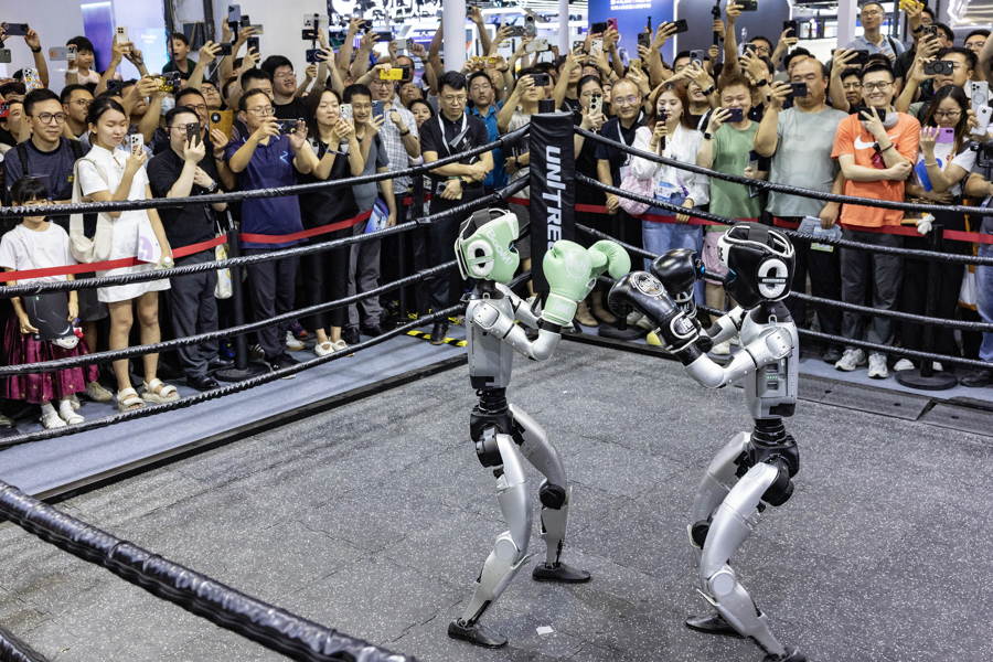 2025年7月26日,上海,世界人工智能大会现场,宇树G1机器人身高1.32米、重35公斤,凭借29个灵活关节和智能平衡算法,在展台演绎"武林争霸"。