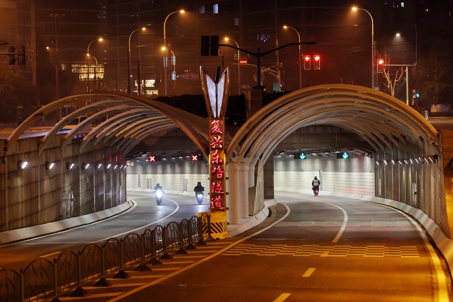 2025年2月16日,上海,复兴东路隧道上层于2月16日起每晚23时至次日凌晨5时开放电动自行车试通行,这座城市为骑行的夜归人点亮了一盏灯。