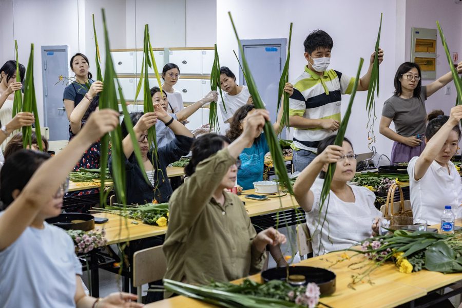 2025年9月2日,上海,在徐汇区育林进修教学点的插花课上,一名男学员制作直立式盘花。这也是9月1日上海市民艺术夜校秋季开班以来,首批推出的日校课程之一。