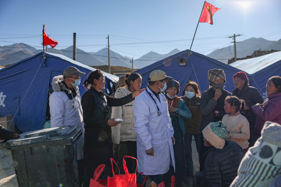 2025年1月15日,西藏日喀则,定日县曲洛乡左措村受灾群众安置点,定日县卫生服务中心主任、上海第十批援藏干部徐先锋第一时间和来自上海援藏医疗队的申建伟、赖跃兴等五名医生组成巡诊小分队,奔赴在震中地区,每天往返150公里,踏遍3个重点受灾乡进行巡诊,至今已服务受灾群众千余人,免费发放急需药品1600多盒。