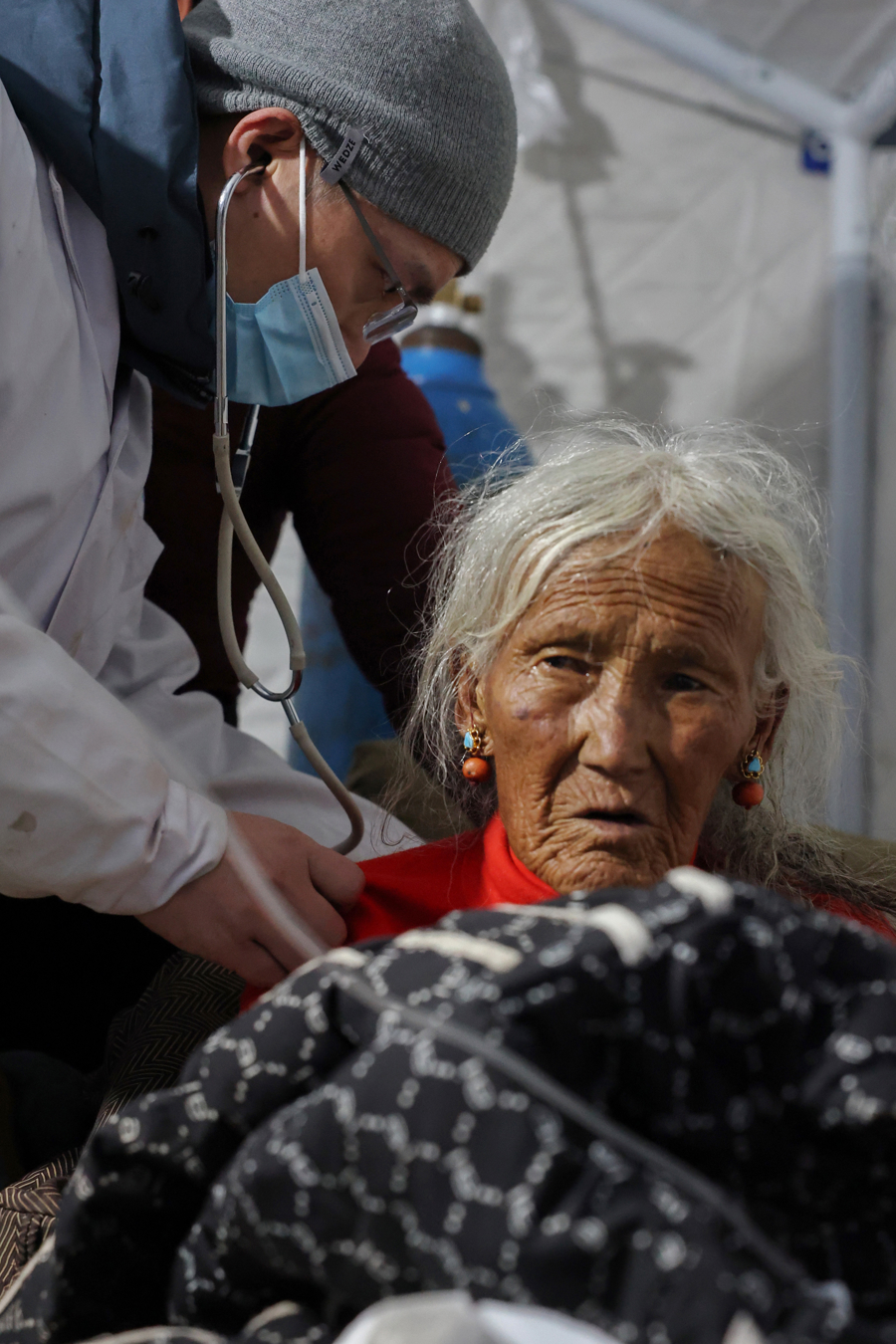2025年1月15日,西藏日喀则,定日县人民医院帐篷救治点,上海援藏医疗队队员赖跃兴为一名在地震中受伤的藏族老奶奶会诊。