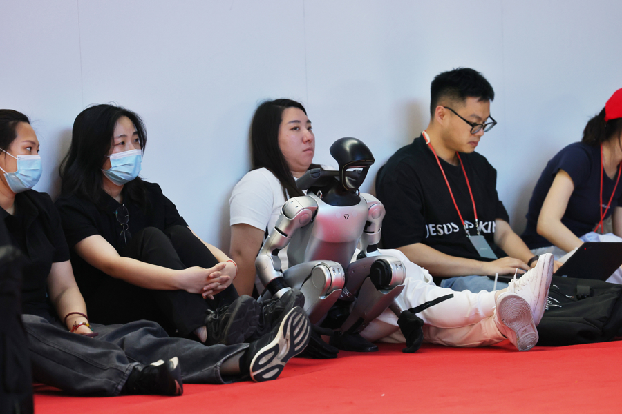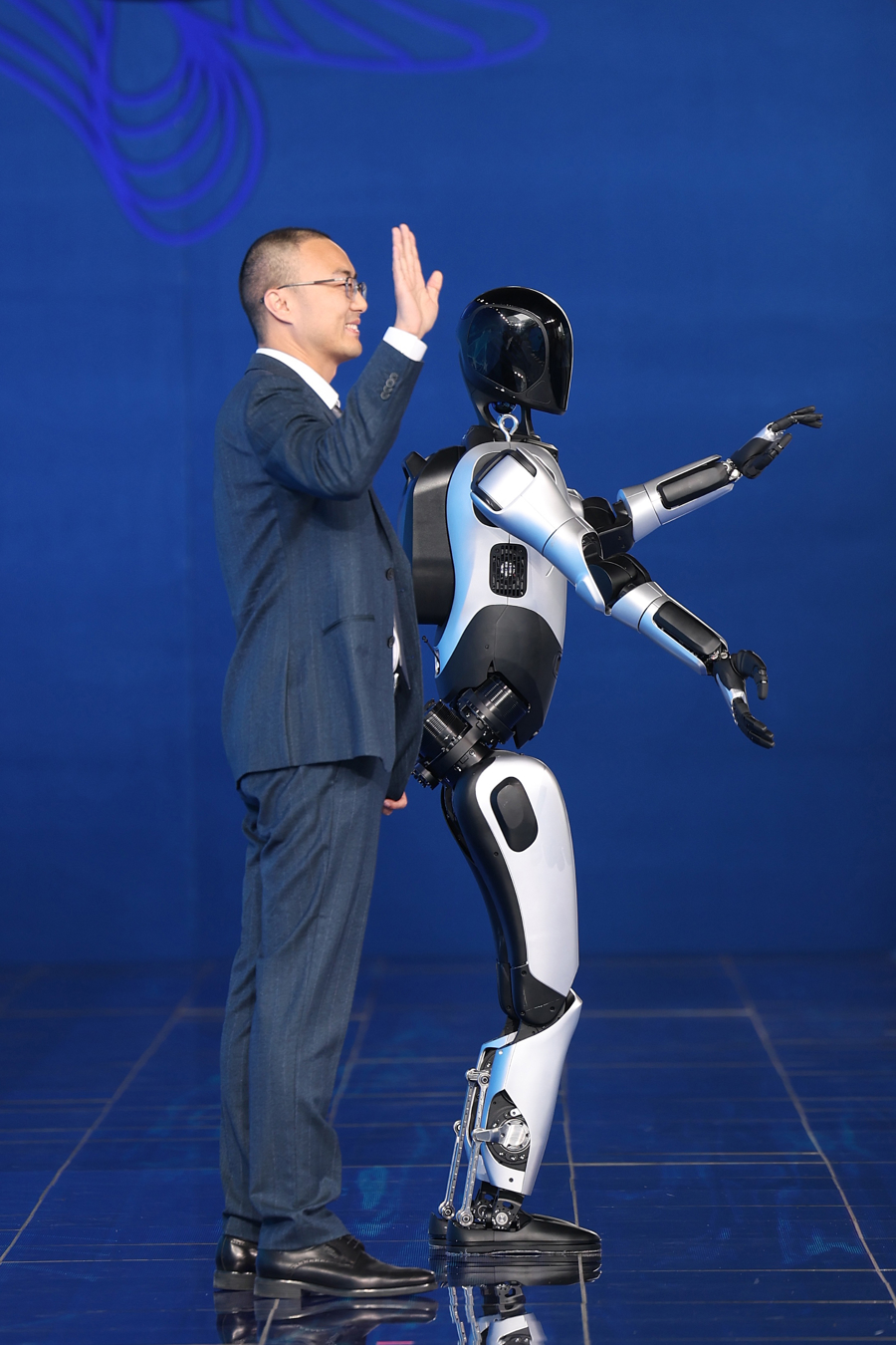 2025年5月17日,上海,信泰资本智元通用产品线总裁王闯和“远征A2”机器人一起走上红毯。当天,上海科技节一年一度的科学家红毯秀举行,30余位老、中、青三代科学家款款走来,3位人形机器人成为全场焦点。