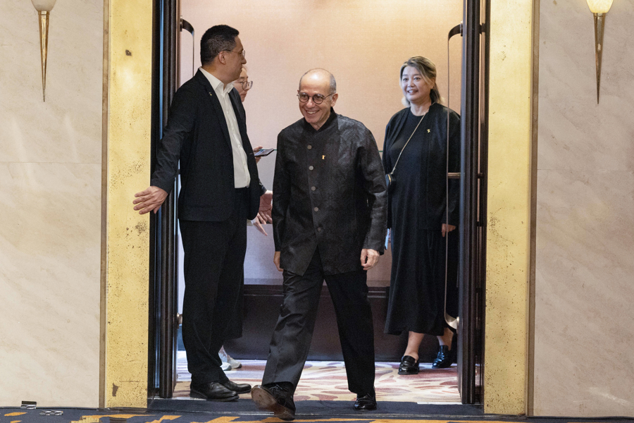 2025年6月13日,上海,第27届上海国际电影节金爵奖主竞赛单元的7位评委正式亮相。图为主竞赛单元评委会主席托纳多雷微笑步入媒体见面会会场。