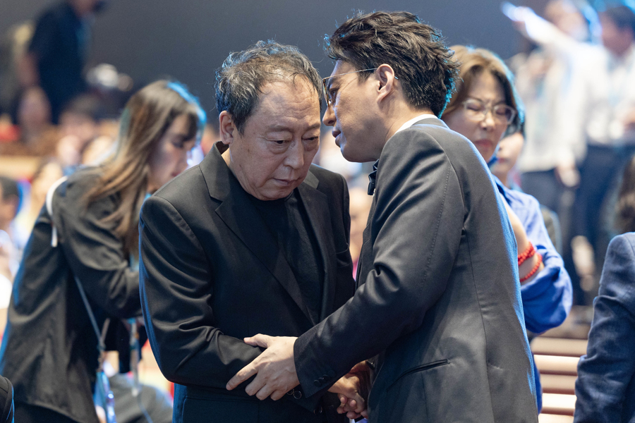 2025年6月25日,上海,第30届上海电视节白玉兰奖最佳男主角得主靳东在颁奖仪式前与演员倪大红握手寒暄。