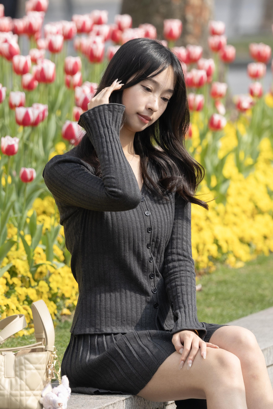 2025年3月11日,上海,外滩郁金香绽放,在花海前留影的女孩。