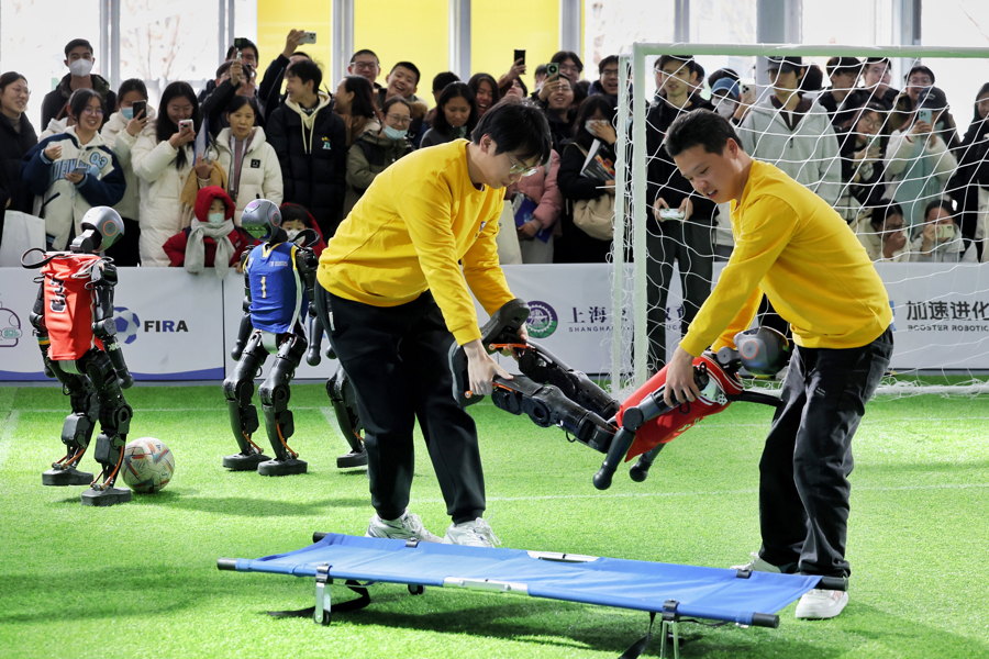 2025年2月22日,上海,全球开发者先锋大会召开,一个机器人在足球对抗赛中倒地“受伤”,被工作人员用担架抬走。