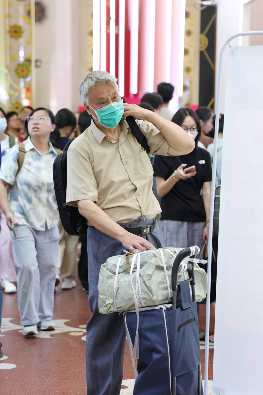 2025年8月13日,上海,2025上海书展开幕首日,上海展览中心西馆二楼人潮涌动,75岁的张伯伯拉着买菜用的双轮拉杆车,里面塞满了他的书展“战利品”,顶部还摞了一叠打包好的书,重量达百斤。辗转于各个展台之间,虽然吃力,但他乐此不疲。