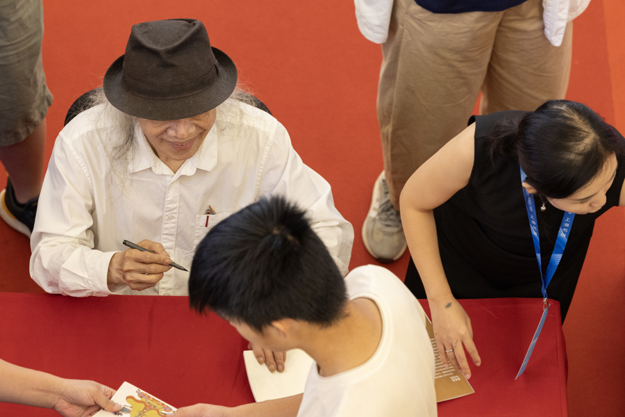 2025年8月14日,上海,台湾漫画家蔡志忠为书展读者签名售书。