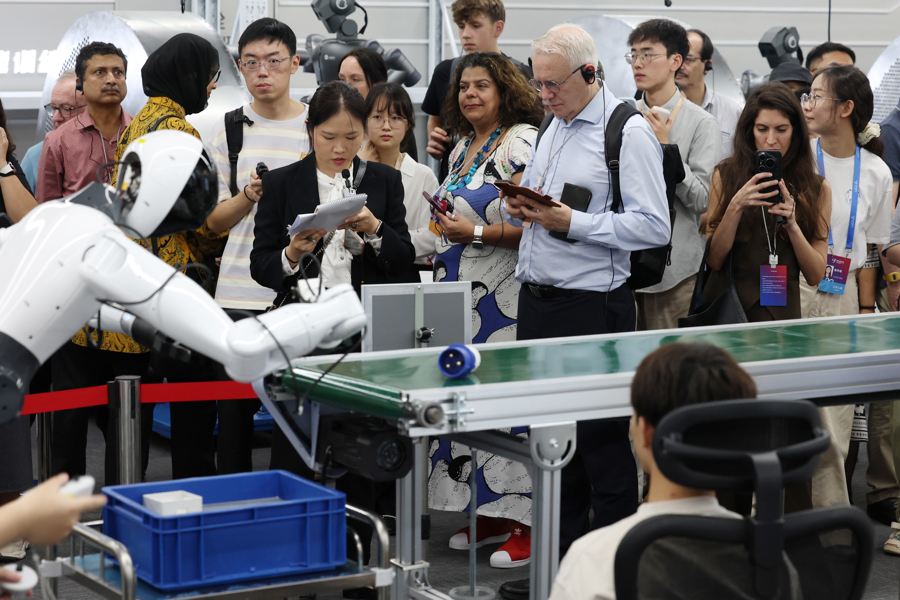 2025年10月13日,上海,参与第二届世界中国学大会的各国学者来到张江机器人创新中心,体验中国的前沿科技,参观人形机器人训练。