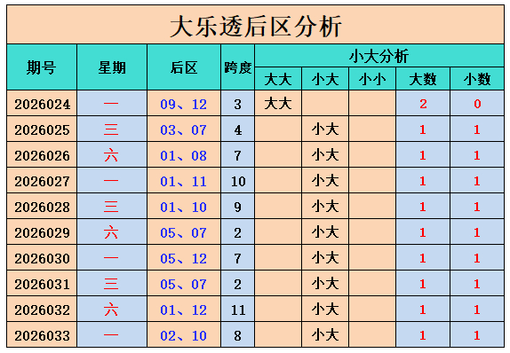最近10期后区大小比为11:9,最近10期后区大大组合开出1期,小大组合开出9期,小小组合开出0期。上期开出小大组合,本期看好大大组合出现。