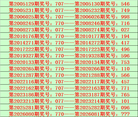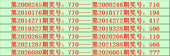 罗列三第2026080期开出奖号770,该号码直选类型历史上出现了7次,前6次开出之后期下期奖号为:716、194、417、596、110、566,见下表: