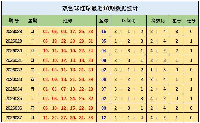 上期总结:双色球第2026037期开出奖号:红球11、22、27、29、31、33;蓝球12,其中红球三区比为1:1:4,开出1枚重号22;开出0组连号,蓝球开出三区号码12。