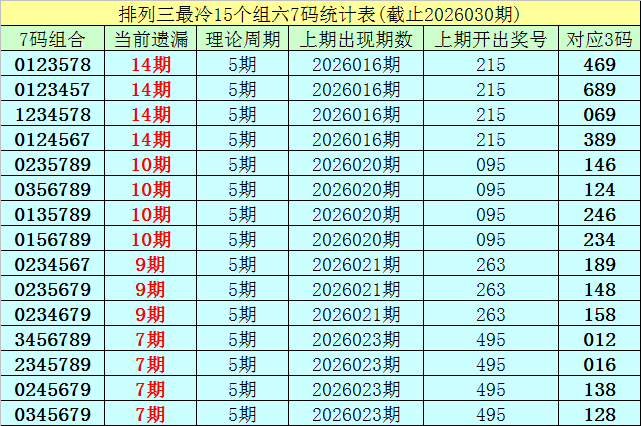 (1)在排列三已开出的7505期奖号中(统计截止第2026030期),目前7码组六遗漏值最大的组合为:0123578、0123457、1234578、0124567,本期遗漏14期;