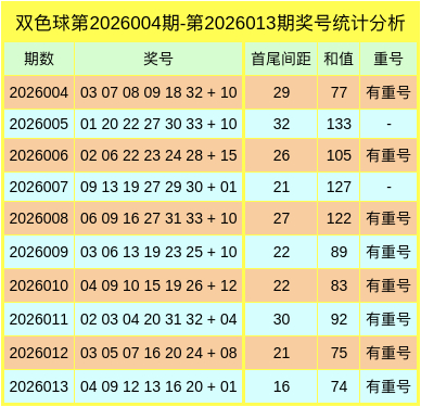 上期红球和值为74,开出2枚重号16,20,开出2枚连号12,13,首尾间距为16。
