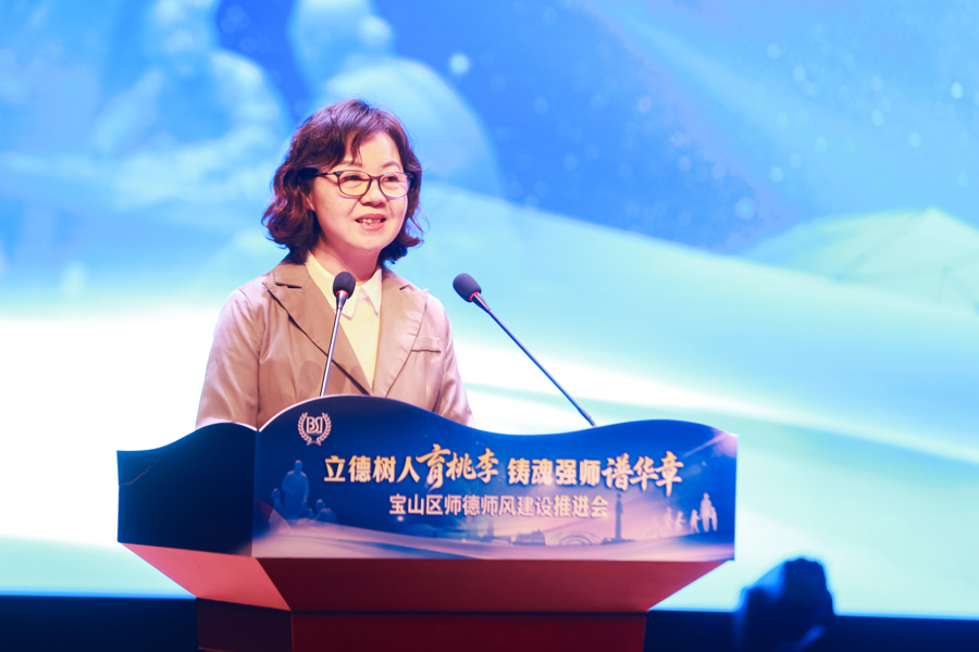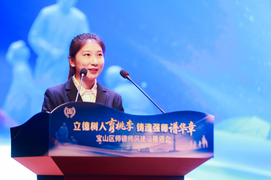 会上,除了成霄,海滨中学党支部书记、校长唐红珍,宝山实验学校班主任曹怡婷也分别登台,用各自的工作实践,讲述着藏在讲台、操场、班级里的师德故事,让“爱的教育”有了更具体的模样。