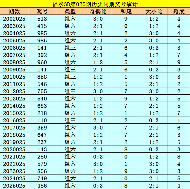 福彩3D历年第025期同期奖号为:513 415 985 985 141 392 960 141 858 546 755 540 683 218 110 359 647 237 143 280 579 856 749 486。