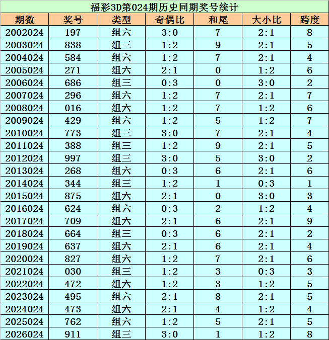 福彩3D历年第024期同期奖号为:197 838 584 271 686 296 016 429 773 388 997 268 344 875 624 709 664 637 827 030 472 495 473 762 911。