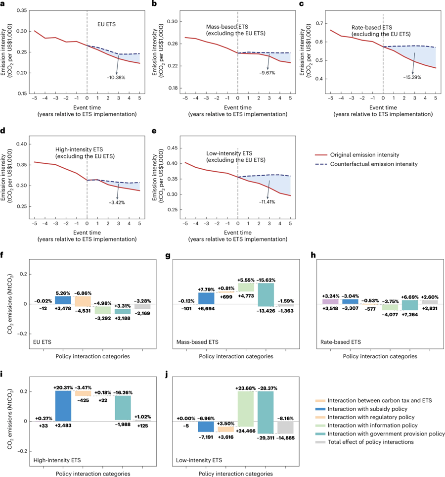 团队研究发现,在全球平均水平下,碳排放权往来体系(ETS)和碳税鉴别能使排放强度缩小约15.4%和8.5%。然则这一已矣在不同政策组合下发扬出显耀各异。