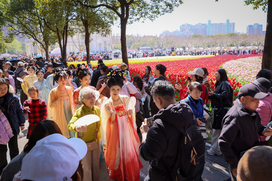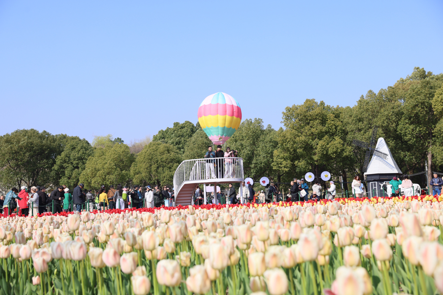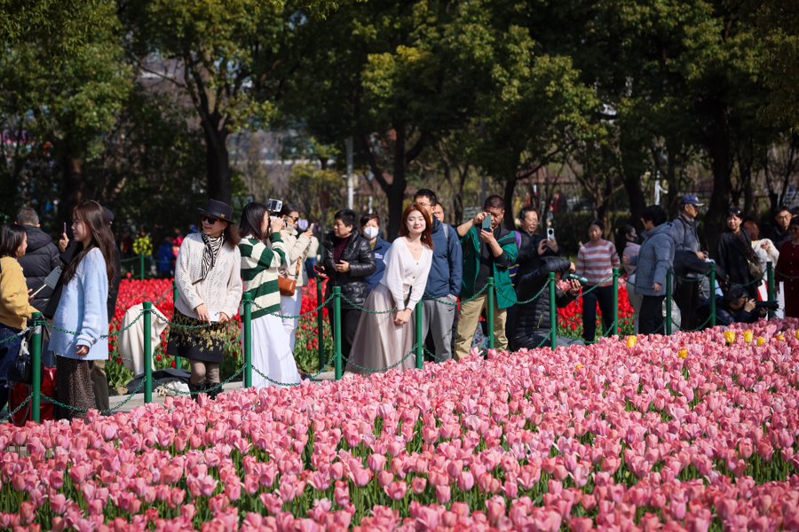 图为:静安花朝节启幕,大宁公园郁金香盛放,招引大都市民前来不雅摩。